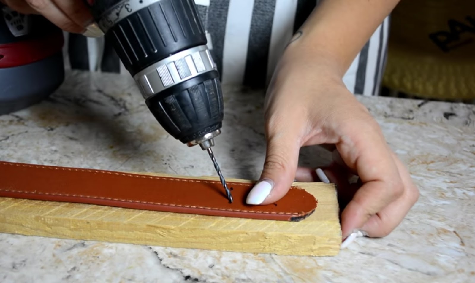 Έπειτα σημαδεύουμε και τρυπάμε τη ζώνη στα σημεία όπου θα περάσουμε κλωστή για να την ενώσουμε με τη τσάντα και να δημιουργηθεί το χερούλι της.