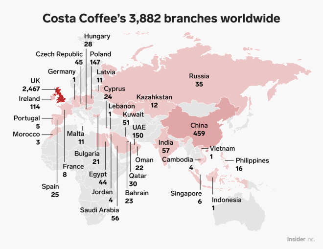 Της σκέψης αυτής είχε προηγηθεί μία σημαντική κίνηση, αυτή της εξαγοράς της μεγαλύτερης αλυσίδας καφέ στην Ευρώπη των Costa Coffee που κυριαρχούν στην Βρετανία. Σύμφωνα με το Business Insider η αλυσίδα, που είχε κάνει και ένα πέρασμα και από την ελληνική αγορά για να αποχωρήσει το 2012, διαθέτει σχεδόν 4.000 καταστήματα από τα οποία τα 2.500 βρίσκονται στην Βρετανία και τα 500 στην Κίνα.