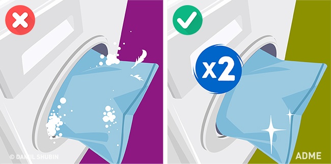 9. Ένας κύκλος πλύσης για μαξιλάρια και κουβέρτες. Αν πλένετε πουπουλένια μαξιλάρια και παπλώματα στο πλυντήριο, τότε κάντε διπλή πλύση: τα πούπουλα παρακρατούν τον αφρό και μετά τον πρώτο κύκλο πλύσης, το απορρυπαντικό μπορεί να παραμείνει.