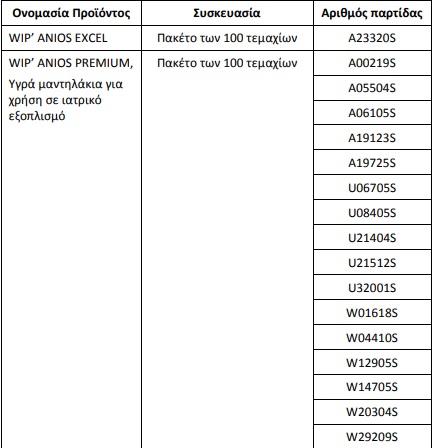 Για την ανάκληση των υγρών μαντηλακίων ‘’WIP’ ANIOS EXCEL ’ και ‘’WIP’ ANIOS PREMIUM’’ διότι, σύμφωνα με την κατασκευάστρια εταιρεία, μία πηγή μικροβιακής επιμόλυνσης που έχει ταυτοποιηθεί και εντοπιστεί σε μία παραγωγική διαδικασία εξωτερικού συνεργάτη, ενδέχεται να προκαλέσει βακτηριακή επιμόλυνση σε ορισμένες παρτίδες υγρών μαντηλιών, ενημερωθήκαμε από τον Εθνικό Οργανισμό Φαρμάκων (ΕΟΦ).