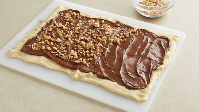 Απλώνουμε τη μισή ζύμη πάνω σε επιφάνεια και στη συνέχεια αλείφουμε με την πραλίνα φουντουκιού και πασπαλίζουμε με τα φουντούκια. Γύρω από τη ζύμη θέλουμε ένα μικρό περιθώριο χωρίς υλικά. Τοποθετούμε επάνω το άλλο φύλλο και κλείνουμε τις άκρες πιέζοντας. Στη συνέχεια κόβουμε λωρίδες, τις στρίβουμε και τις τυλίγουμε έτσι ώστε να δημιουργηθεί ένα μικρό μάφιν.