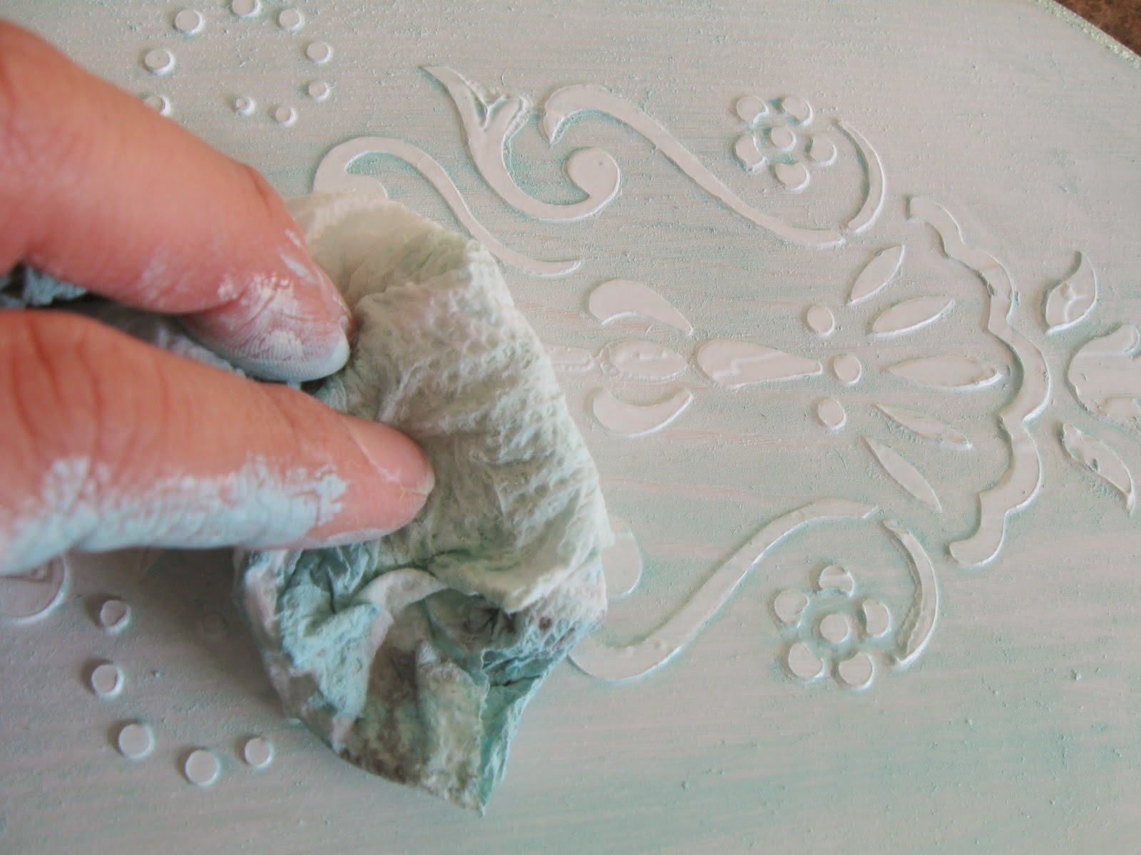 Θα χρησιμοποιήσετε έτοιμο λευκό στόκο που θα βρείτε σε όλα τα χρωματοπωλεία, καταστήματα με εργαλεία κλπ ή και σκόνη χρωματιστού στόκου σε όποια απόχρωση θέλετε τον οποίο θα αραιώσετε με νερό και μια απλή σπάτουλα με την οποία θα “γεμίσετε” τα κενά σημεία του σχεδίου ισιώνοντας – λειαίνοντας την ποσότητα στόκου που κάθε φορά απλώνετε ώστε τελικά να απομείνει μια πολύ λεπτή στρώση που μετά την αφαίρεση του stencil έχει όψη και υφή γύψινου διακοσμητικού.