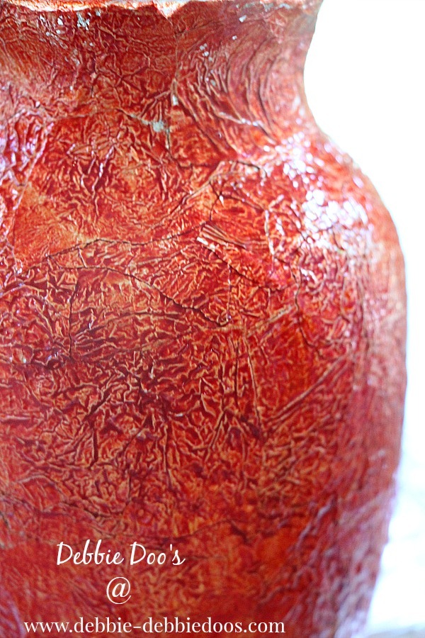 3. Όταν στεγνώσει εντελώς η μπογιά, περάστε ολόκληρη την επιφάνεια του βάζου με απλό βερνίκι decoupage που θα αδιαβροχοποιήσει και θα προστατέψει την κατασκευή ή με ένα μεταλλικό glaze (λούστρο) που επιπρόσθετα θα προσφέρει ένα “μεταλλικό” φινίρισμα, αν φυσικά δεν έχετε μετά το απλό ακρυλικό χρώμα χρησιμοποιήσει πατίνες, μεταλλικά χρώματα κλπ.